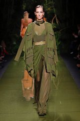 At Balmain, Olivier Rousteing succeeds in sexing up the military look with his sensual army. A high split adds a bold touch to the transparent lower part of the first look; whereas numerous cut-outs – notably underboob-revealing ones - distinguish the upper one. Our favorite detail about this attire is definitely the intertwined leather belts: they beautifully break the monotony of the army green color, while skillfully highlighting the model’s waist.