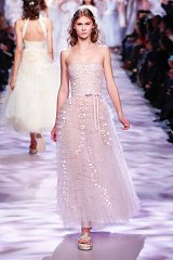 This dress echoes spring’s exuberant mood with its two layers of hand painted flowers, the second with acrylic embossing, adding an additional shining layer.